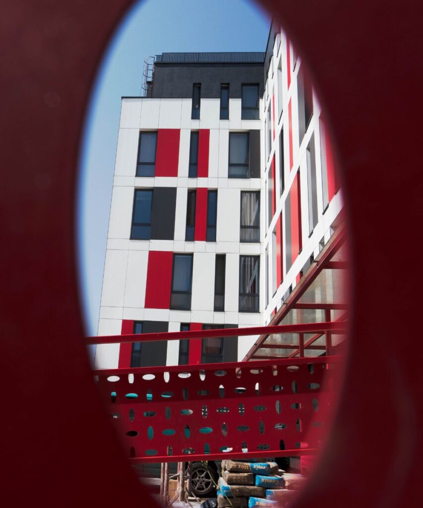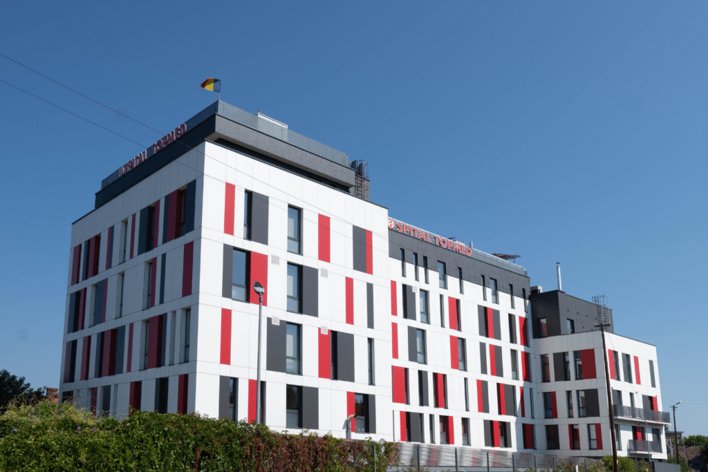 Entwurf, Ausführung und Montage von Aluminiumfenstern und -türen sowie Vorhangfassaden mit Alumil-Systemen, ergänzt durch eine hinterlüftete Verkleidung mit HPL-Platten. Gesamtfläche: ca. 3.100 m². Ein Projekt im medizinischen Bereich, das Nachhaltigkeit, Ästhetik und Funktionalität in einer Lösung vereint, die den Anforderungen moderner Sanitärräume gerecht wird.