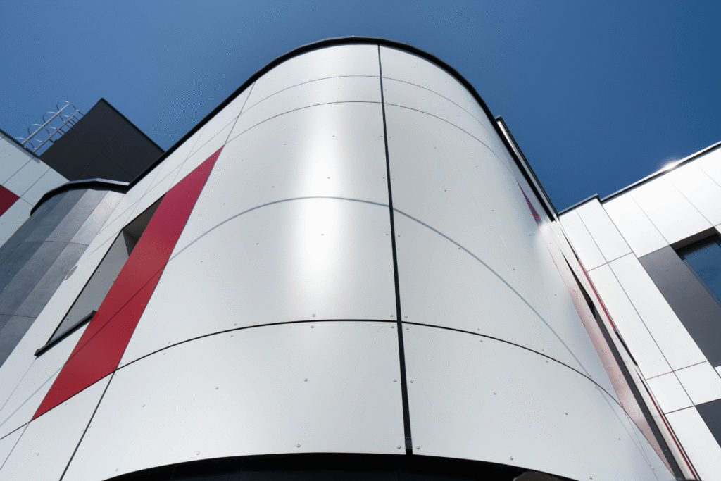 3.100 m² großes Projekt im medizinischen Bereich mit Alumil-Systemen und hinterlüfteter HPL-Verkleidung, entwickelt für Widerstandsfähigkeit, Ästhetik und Funktionalität